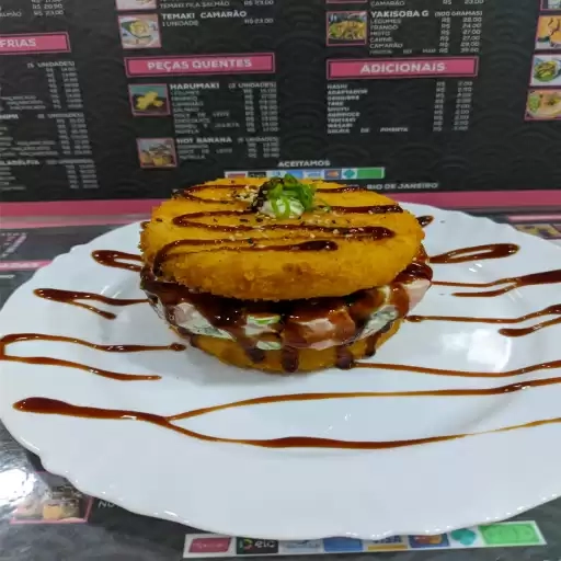 Delicioso hambúrguer de arroz empanado, com recheio de salmão, cream cheese e cebolinha